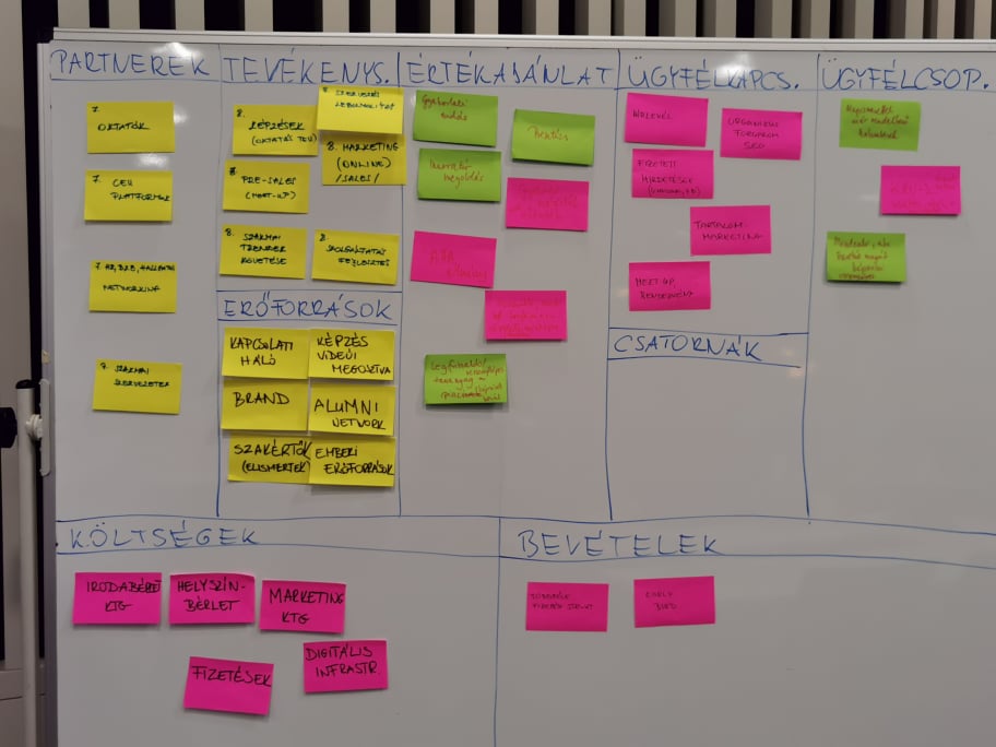 Igen, általában mi javasoljuk ezt az eszközt – bár van, hogy valaki már találkozott vele, de egyedül nem állt neki – és utána a mi útmutatásunk, facilitálásunk alapján elkezdik kitölteni. Fontos szemléletként már az elején hangsúlyozzuk azt az alapvetést, hogy a vállalat bevételei az ügyféltől származnak, azaz a vállalat egész működését onnan vizsgáljuk, hogy miként tudunk az ügyfeleknek értéket teremteni. Sokszor már itt el tudnak akadni, és tisztázniuk kell maguk számára: ki is az ügyfél, és mi is a termék? Például sok esetben a terméket, szolgáltatást megvásároló vevő és a vállalat között vannak közvetítő cégek, akik mutatnak bizonyos szempontból vevői aspektusokat, de mégsem ők az ügyfelek, hanem az, aki a végén használja a terméket. Utána tisztázzuk azt, hogy milyen csatornákon találkoznak, kommunikálnak az ügyfelekkel, ezt követően pedig az előállítás költségeire térünk ki, majd arra, hogy melyek a kulcstevékenységek, kulcspartnerek és erőforrások. Itt is sok meglepetés, felismerés éri őket, például, hogy melyek az igazán fontos erőforrások, partnerek, vagy hogy a tevékenységekből mit lehet akár kiszervezni.